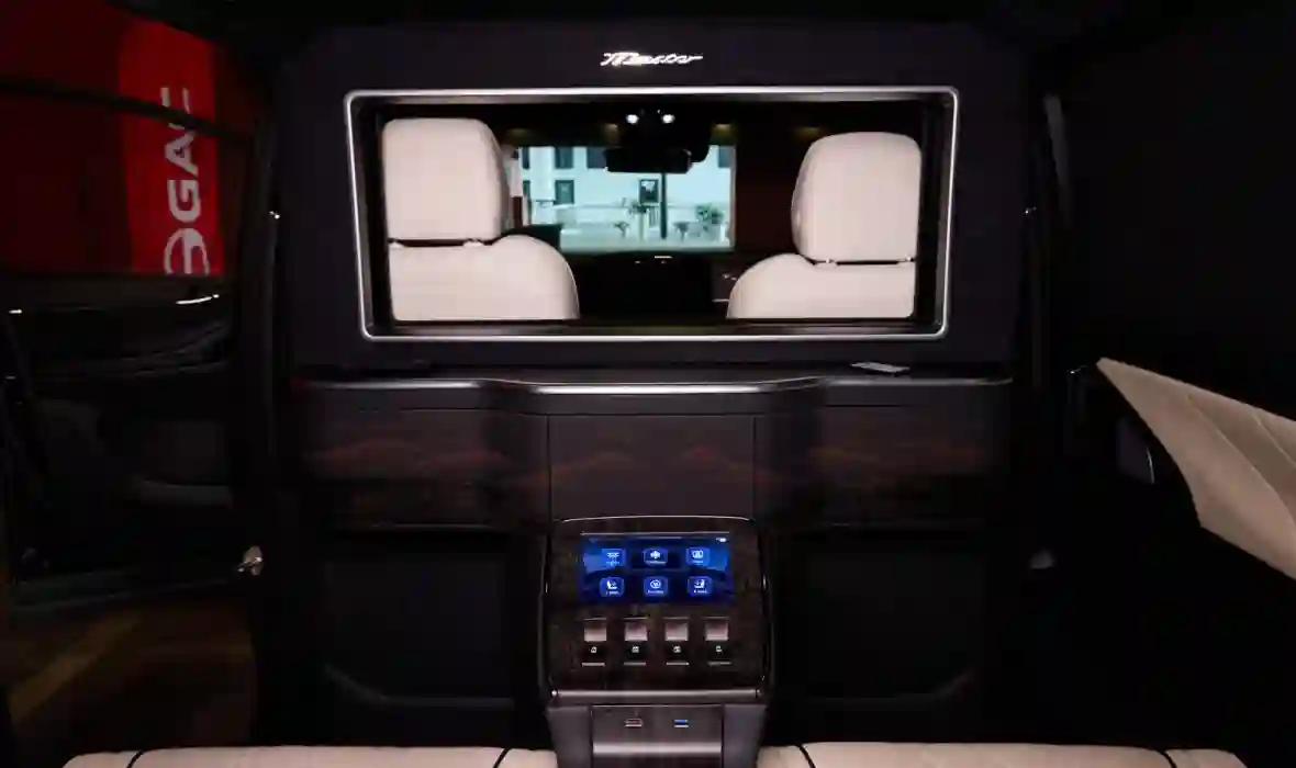 Для удобства пассажиров второго ряда у каждого сиденья предусмотрена своя беспроводная зарядка для смартфона, USB-разъемы и столики, которые можно использовать как подставку для ноутбука во время работы.Для максимального комфорта в перегородку встроен мини-бар с холодильником до –10 °C, который позволяет наслаждаться охлажденными напитками в долгих поездках. Эффектный потолок с подсветкой “Звездное небо”, возможность ароматизации воздуха в салоне и трехзонная система климат-контроля превращают каждую поездку в особенное событие. В отделке используются роскошные декоративные элементы с текстурой агатового дерева и серые хромированные вставки, подчеркивающие премиальный характер автомобиля.